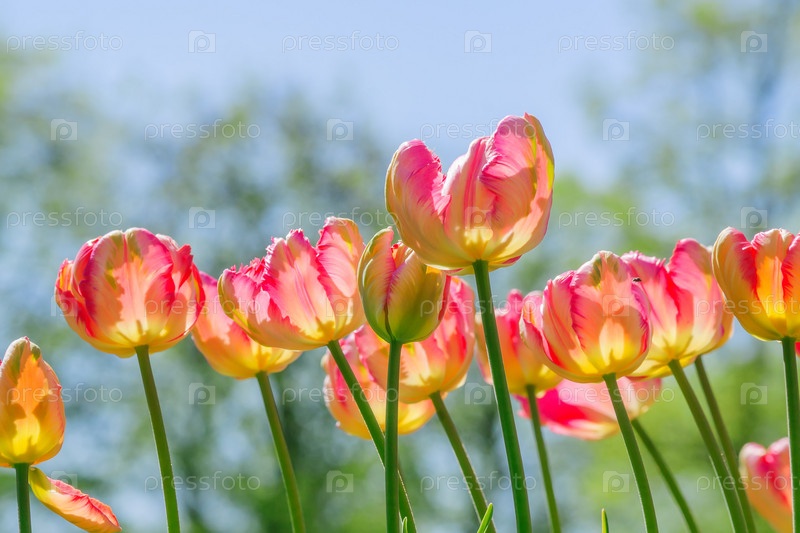 Естественный фон весенних цветущих цветов. Поле ярко-розовых и оранжевых тюльпанов на фоне голубого неба