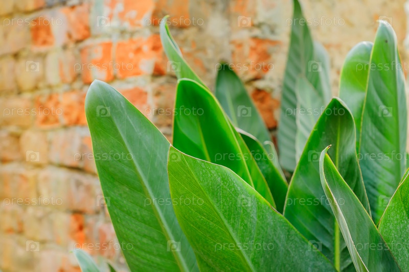 Зеленые листья тропического растения рядом с кирпичной стеной лофта. Фоновая текстура