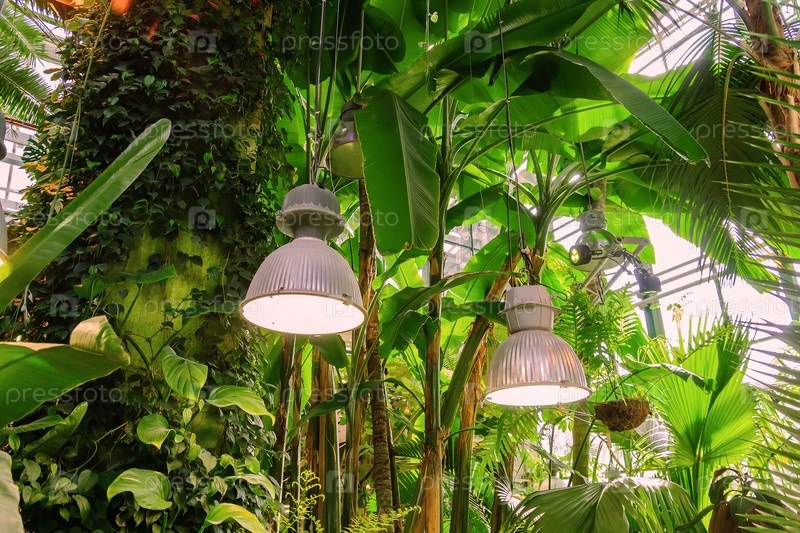 Пышная листва в тропическом саду. Бананы и растения джунглей. Естественный фон