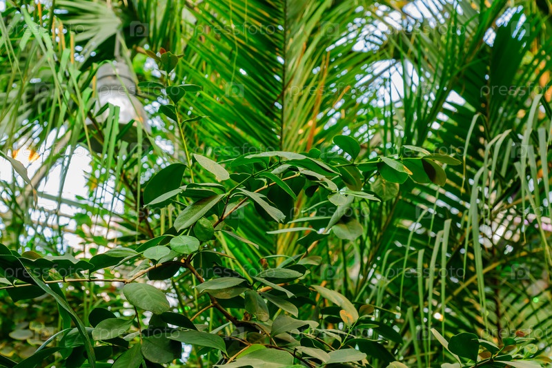 Пышная листва в тропическом саду. Бананы и растения джунглей. Естественный фон