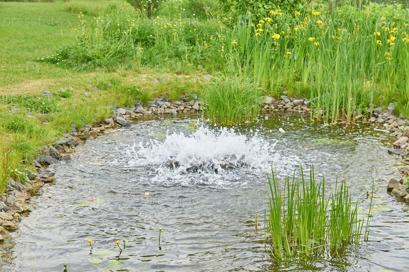 Декоративный пруд и фонтан с брызгами воды, травы и цветов