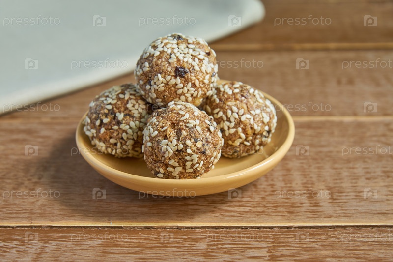Здоровые органические энергетические мюсли с орехами, какао, черносливом, кунжутом и медом - веганские и вегетарианские сырые закуски на деревянном фоне