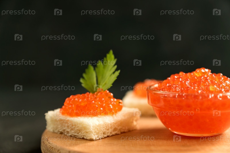 Вкусная красная икра на пшеничном хлебе с петрушкой на деревянном столе