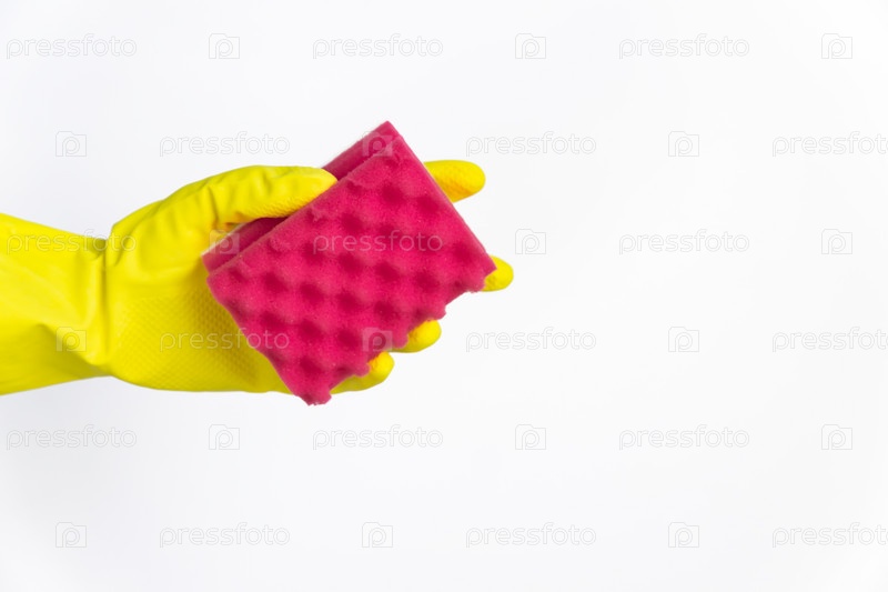 Рука с желтой перчаткой, держащая красную губку для чистки на белом фоне