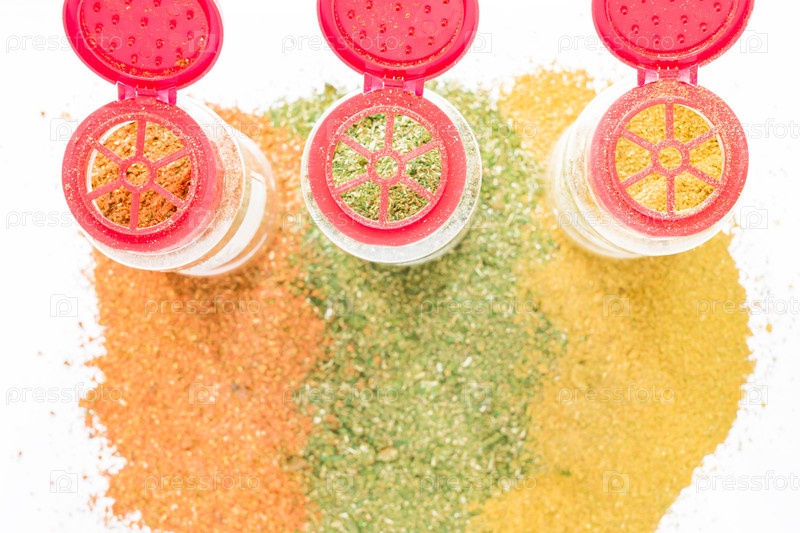 Вид сверху на три пластиковые бутылки со специями для приготовления пищи