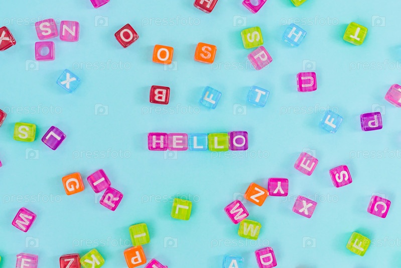 Разноцветные пластиковые кубические бусины с буквами, разбросанными на синем фоне, и словами привет. Фоновая текстура английского алфавита