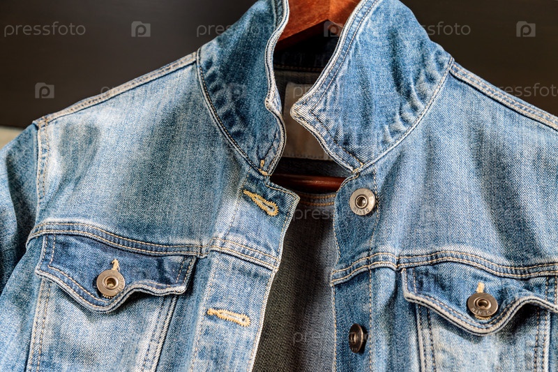 Голубая джинсовая куртка на деревянной вешалке. Модная одежда
