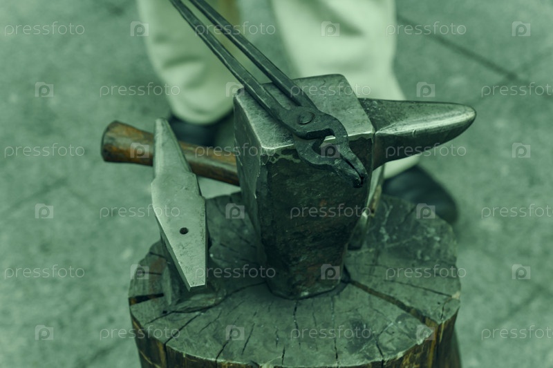 Рабочие металлические инструменты в кузнечной мастерской, крупный план, выборочный фокус, тонирование