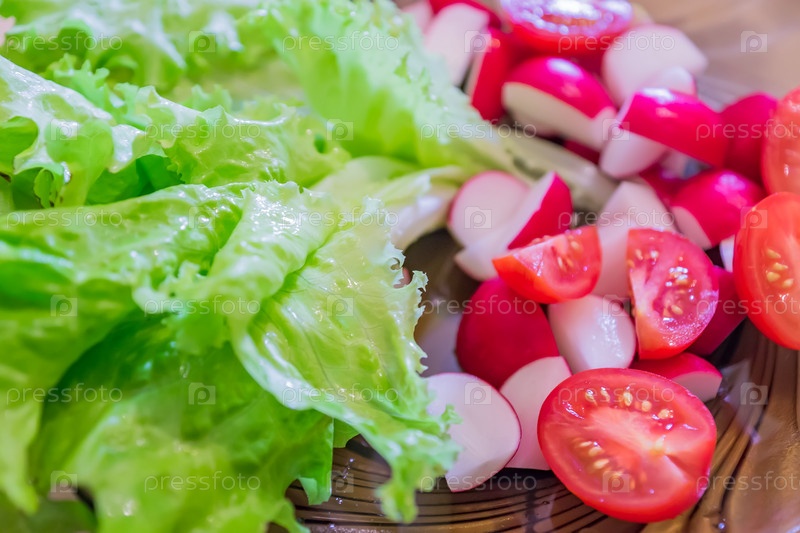 Крупный план свежего вегетарианского салата из помидоров, редьки и салата