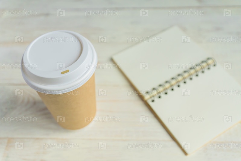 Кофейная чашка из крафт-бумаги и открытый дневник блокнота с местом для копирования на деревянном столе