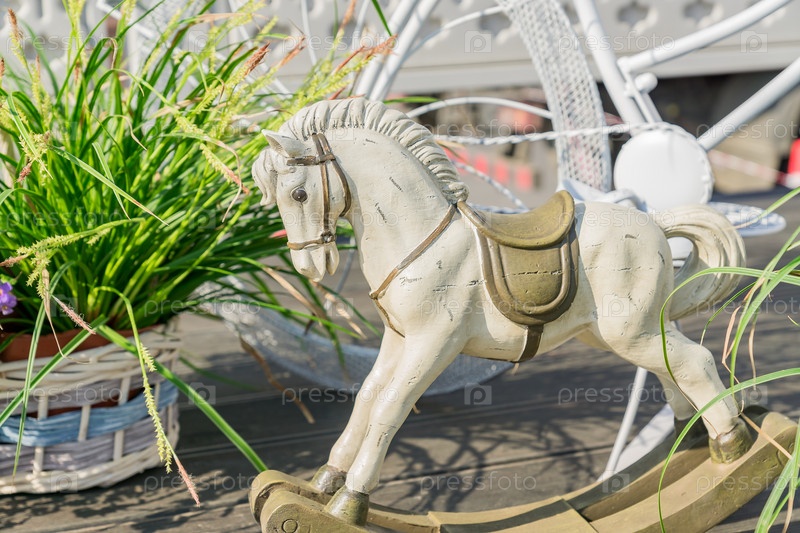 Статуя лошади из белой глины возле зеленых растений в плетеных горшках. Оформление сада