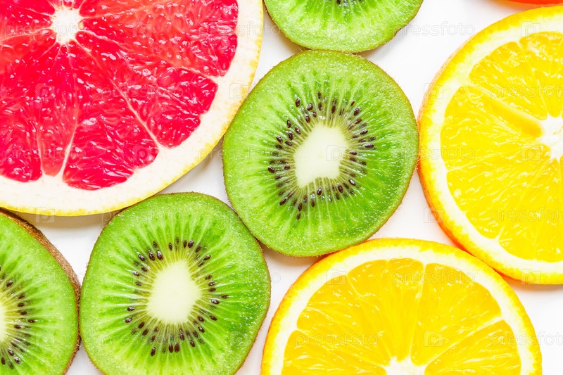 Крупным планом ломтик цитрусовых, киви, апельсины и грейпфруты, изолированные на белом фоне. Фруктовый фон