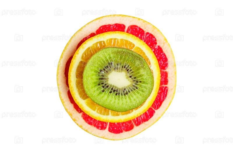Ломтик цитрусовых, киви, апельсины и грейпфруты на белом фоне. Фруктовый фон