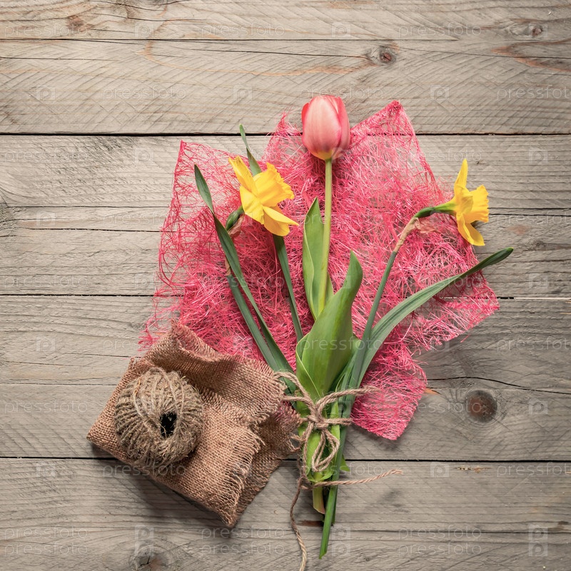 Вид сверху на букет весенних цветов. Желтые нарциссы и розовый тюльпан на деревянном фоне. Скопируйте пространство