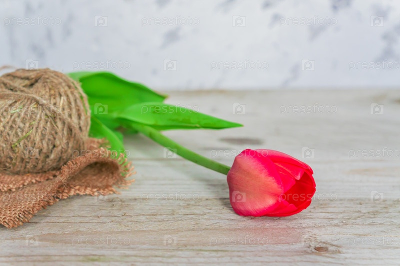 Свежий красивый розовый тюльпан с веревкой на деревянном фоне с копией пространства