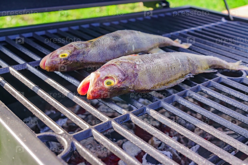 Жареная свежая рыба. Приготовление барбекю из морепродуктов на огне на открытом воздухе