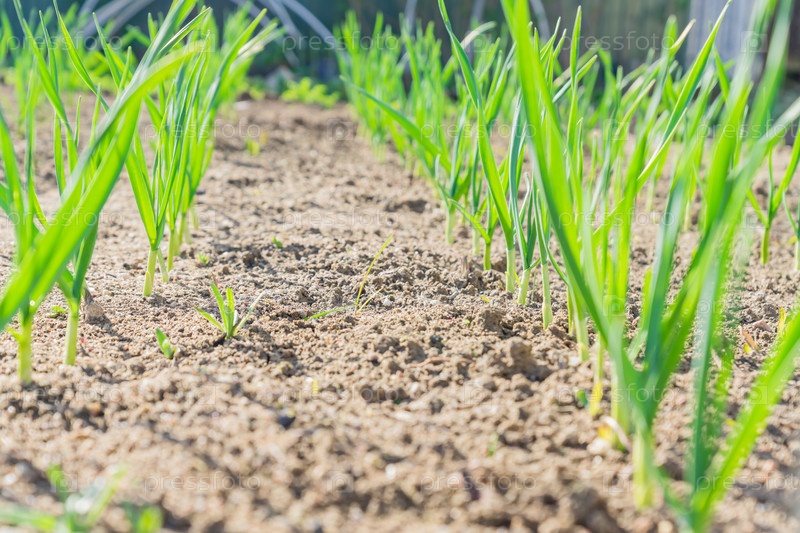 Молодые стебли растущего чеснока Огород ранней весной