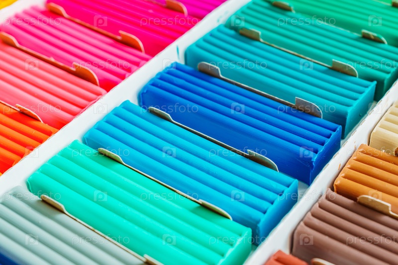 Яркие цвета пластилина для лепки. Разноцветные пластилиновые батончики в коробке, фоновая текстура