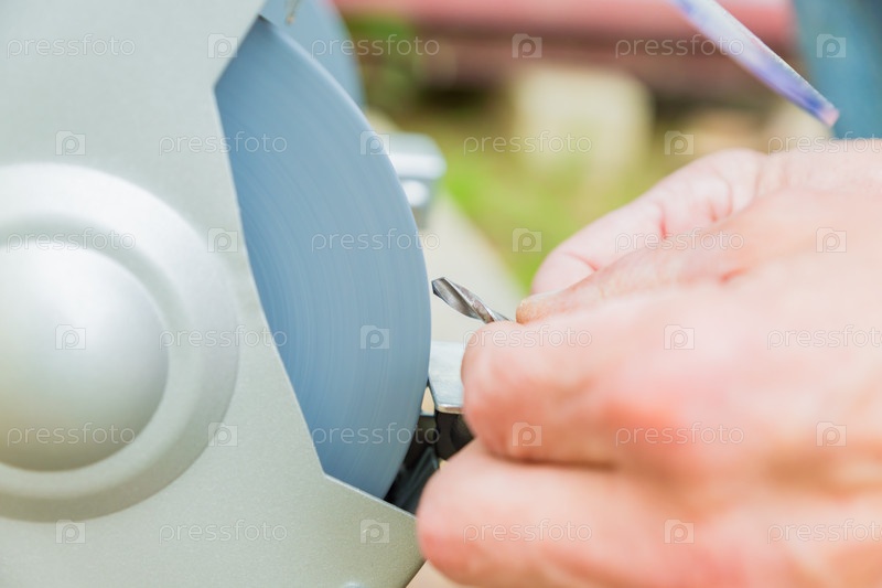 Крупный план промышленного рабочего, затачивающего сверло с помощью точильного станка с абразивным диском