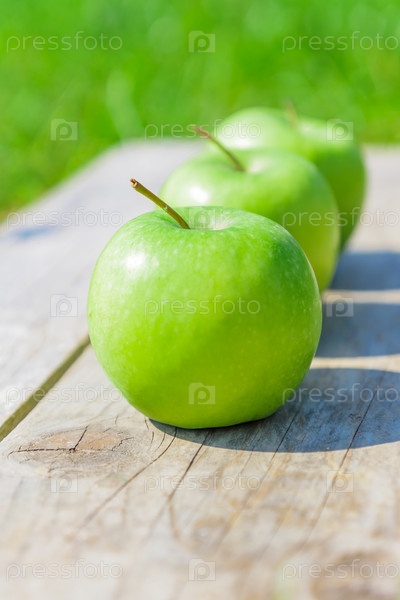 Свежеобрезанные зеленые яблоки на деревянном столе на фоне травы