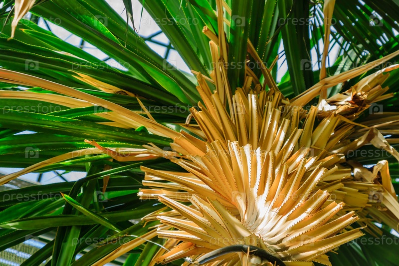 Вид снизу на тропическую пальму. Зеленая листва тропического леса