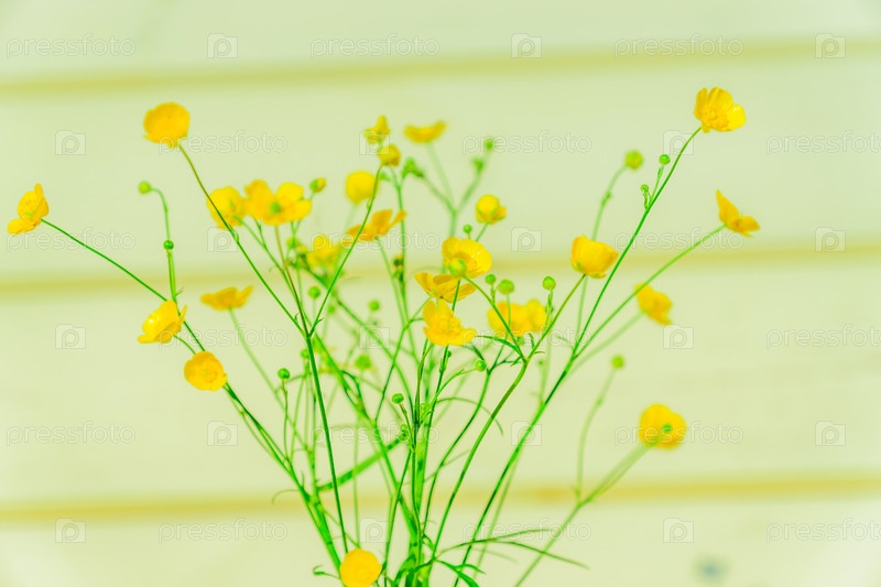 Красивые желтые дикие цветы лютика на фоне деревянной стены. Фон природы