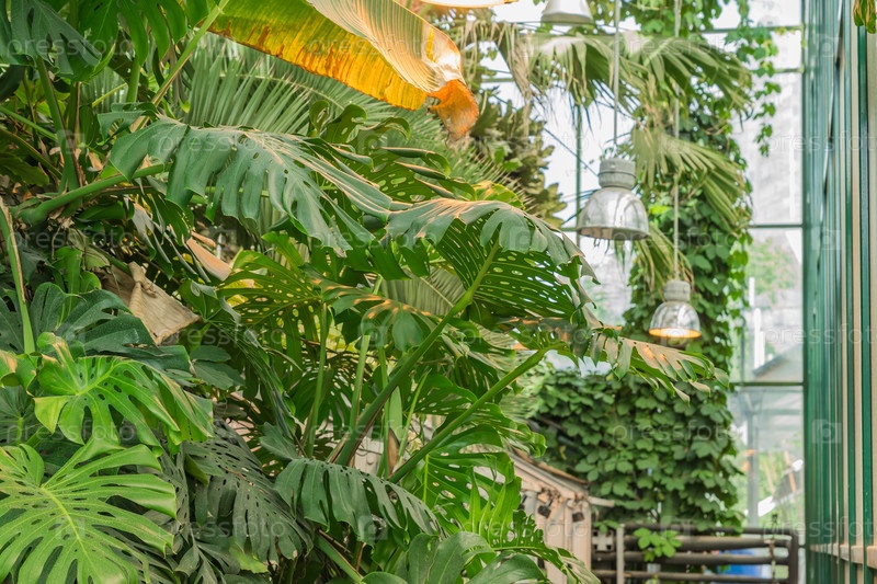 Пышная листва в тропическом саду. Бананы и растения монстеры в джунглях. Естественный фон