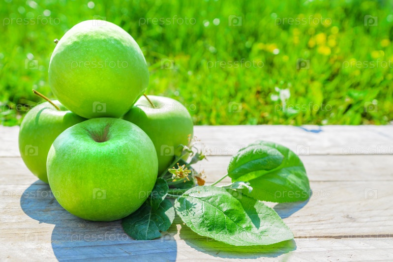 Свежеобрезанные зеленые яблоки на деревянном столе на фоне травы