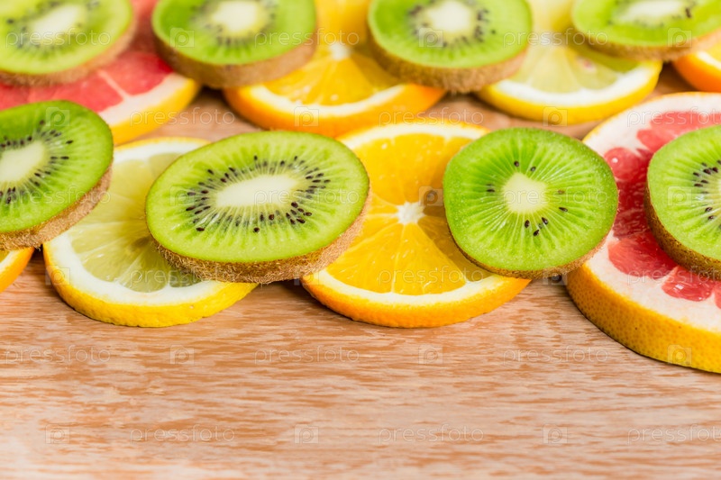 Рамка с кусочками апельсинов, лимонов, киви, грейпфрутов на фоне wppden