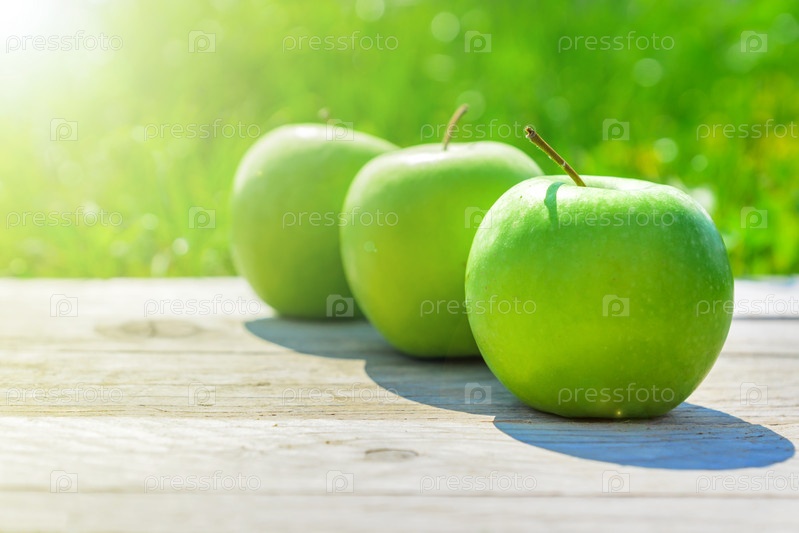 Свежеобрезанные зеленые яблоки на деревянном столе на фоне травы
