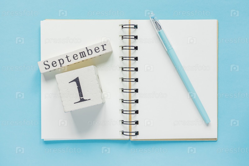 1 сентября в деревянном календаре по учебному учебнику на синем фоне. Вернуться к школьной концепции