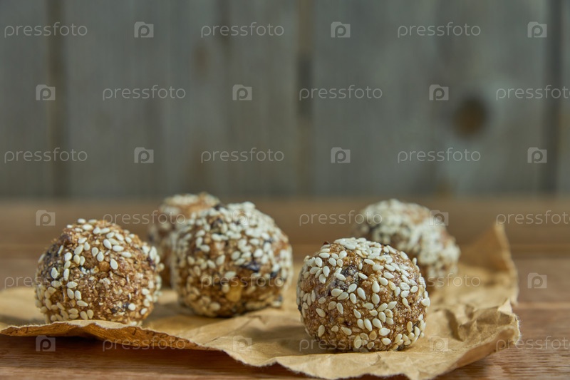 Вкусные веганские сырые протеиновые трюфели или энергетические шарики с черносливом, семенами и орехами, выборочный фокус