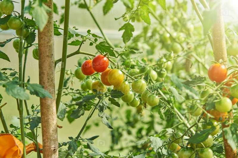 Свежие красные помидоры созревают на лозе в органическом тепличном саду