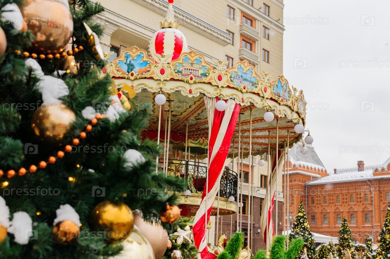 Москва, Россия - декабрь 2018 года - Монежная площадь украшена рождественскими елками и винтажным французским красочным каруселем. Посмотрите на отель Fous Seasons и жёлтое такси. Фестиваль Путешествие в Рождество. Карусель с лошадьми