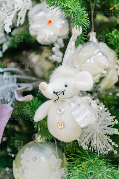 Символ 2020 года. Белая игрушечная крыса в новогодней шапке висит на меховой снежной елке. Праздничное оформление интерьера