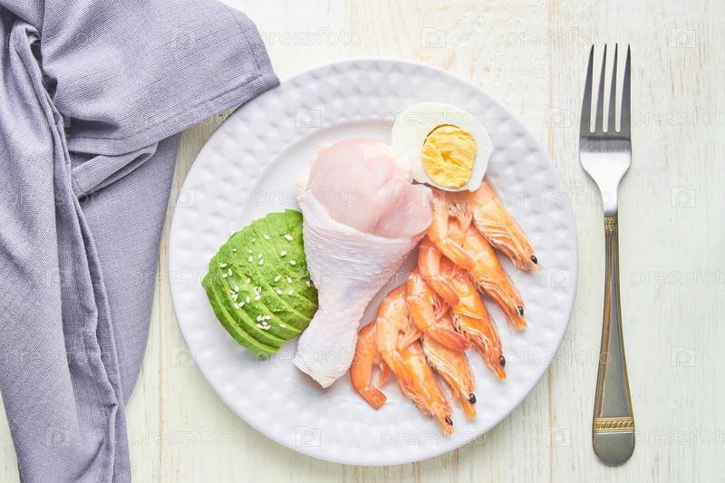 Концепция кетогенной диеты. Набор продуктов для низкоуглеводной кето диеты. Зеленый авокадо, кунжут, куриная ножка, яйца и креветки. Концепция здорового питания