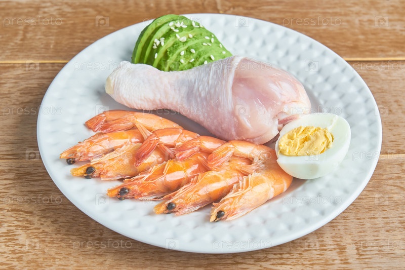 Хорошие источники жира на тарелке - курица, морепродукты, яйца, авокадо, кунжут. концепция здорового питания и кетогенной диеты