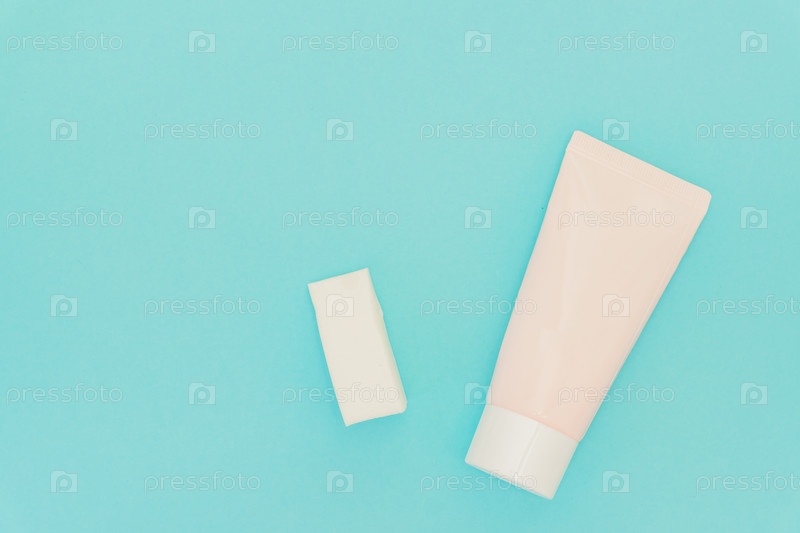 Губки для нанесения основы для лица и розовая трубка с жидкой основой на синем фоне