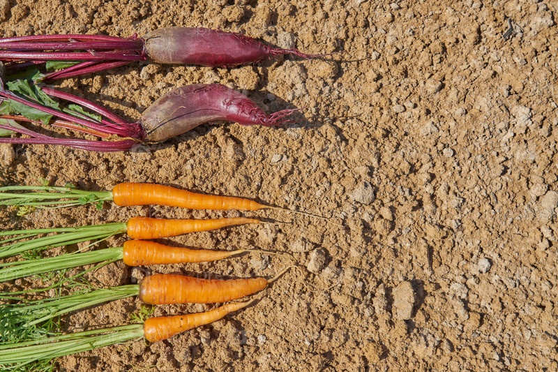Свежесобранная доморощенная органическая свекла, лук и морковь на земле. вид сверху, пространство для копирования