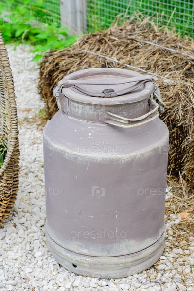 Металлическая бочка или банка для молока на ферме, готовая к транспортировке на завод по переработке молока