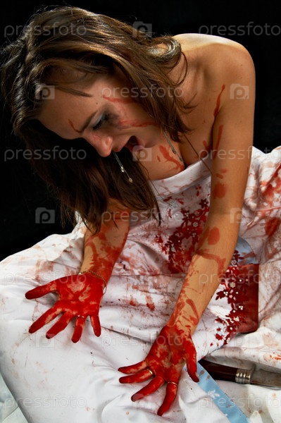 Девушка в белом платье, окровавленная с ножом на черном фоне