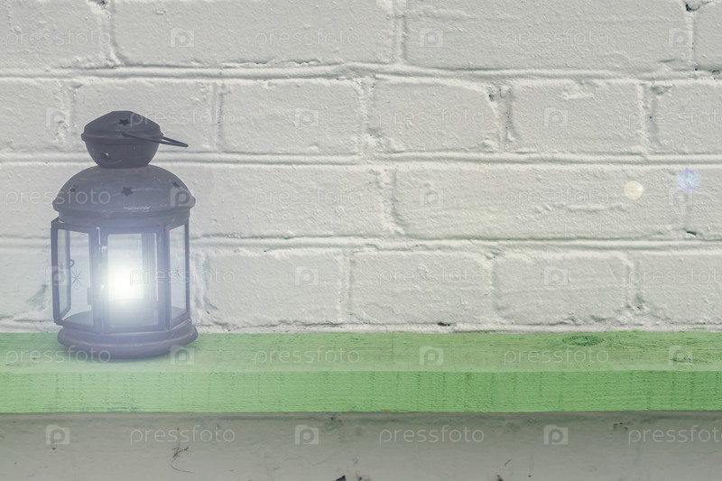 Старый винтажный черный ржавый фонарь на зеленой полке, внутреннее убранство дома