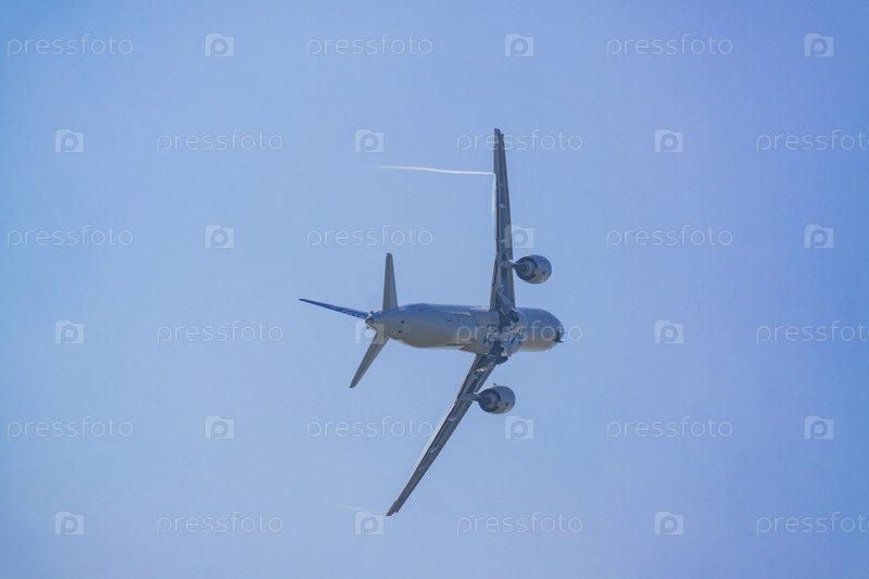 ЖУКОВСКИЙ, РОССИЯ - 31 августа 2019 г.: Новый российский пассажирский самолет МС-21 в небе. Демонстрационный полет на авиасалоне МАКС-2019