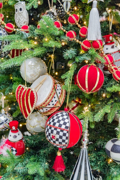 Рождественские и новогодние праздники фон. Рождественская елка украшена красными безделушками, игрушками и гирляндами. Блестящие и сверкающие. Концепция праздника