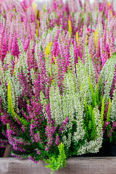 Цветущий вереск розового, белого и желтого цветов. Естественный цветочный фон