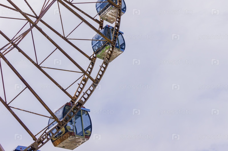 Крупным планом кабины колеса обозрения на фоне облачного неба