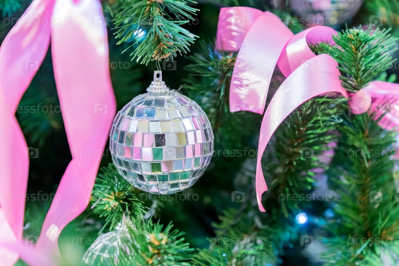 Рождественские и новогодние праздники фон. Рождественская елка украшена серебряными диско-шарами, бантами и гирляндами. Блестящие и сверкающие. Концепция праздника