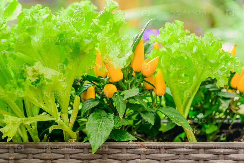 Огород на подоконнике. Зеленый салат и оранжевый перец халапеньо растут в корзине