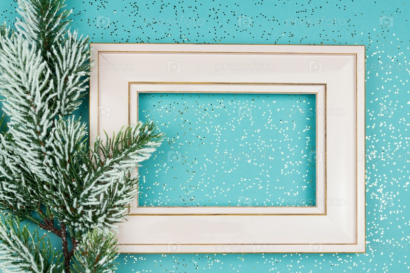 Праздничная открытка на Рождество с фоторамкой, еловая ветка на синем фоне конфетти