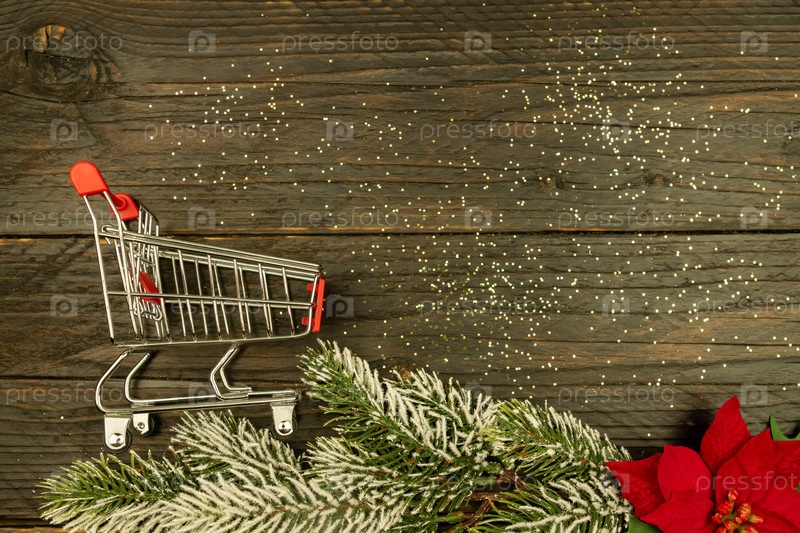 С Новым 2021 годом. корзина на деревянном фоне. Плоская планировка с копией пространства